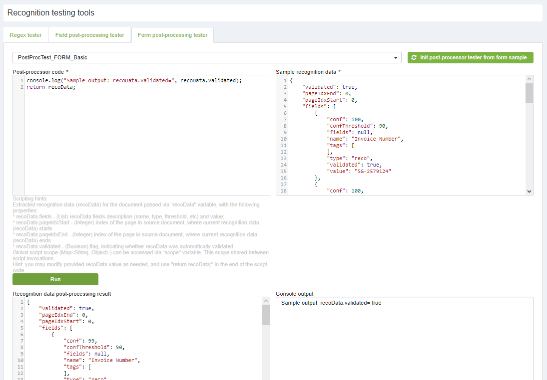 The Form Post-Processing Tester enables you to write and debug code for post-processing recognition results (Recognition data or recoData) collected with the current RecoForm. This feature uses a standard JavaScript engine, so post-processing code should follow standard JavaScript syntax. The page includes scripting hints to assist with available variables for handling and returning recognition result values.