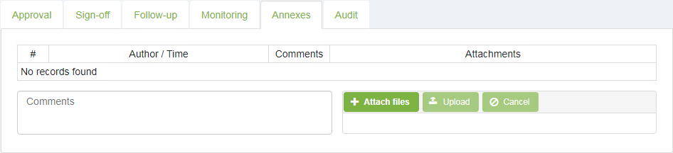 In case it is required to attach the file-attachments to the document form after the document has been sent to the processing (e.g. the scan copy of signed agreement), the Initiator or the Executor may attach the respective file-attachments in the tab Annexes.