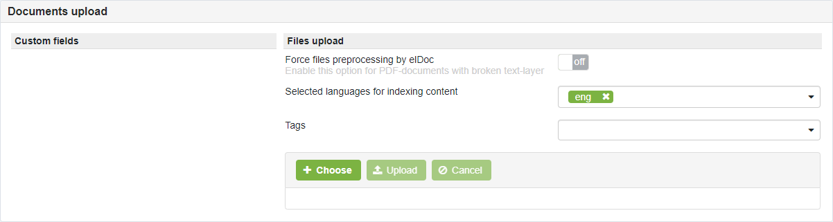 - Tags - sets tags to be assigned for the uploaded documents. Allows to select tags which are already present in the system on Recognition Forms or on the documents.