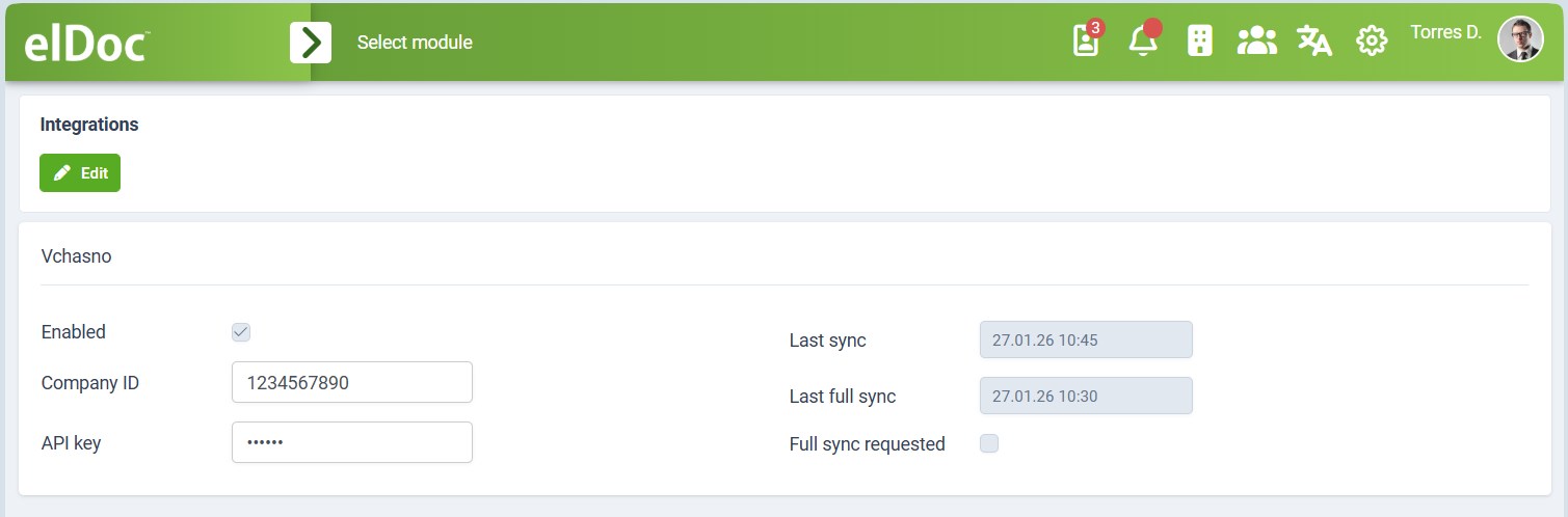 When enabled, the Vchasno integration allows elDoc to synchronize documents and related metadata with the Vchasno platform.