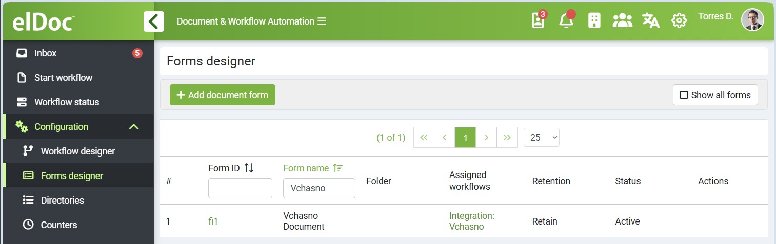 In addition to the workflow, the system also creates a document form used for displaying documents synchronized from Vchasno.