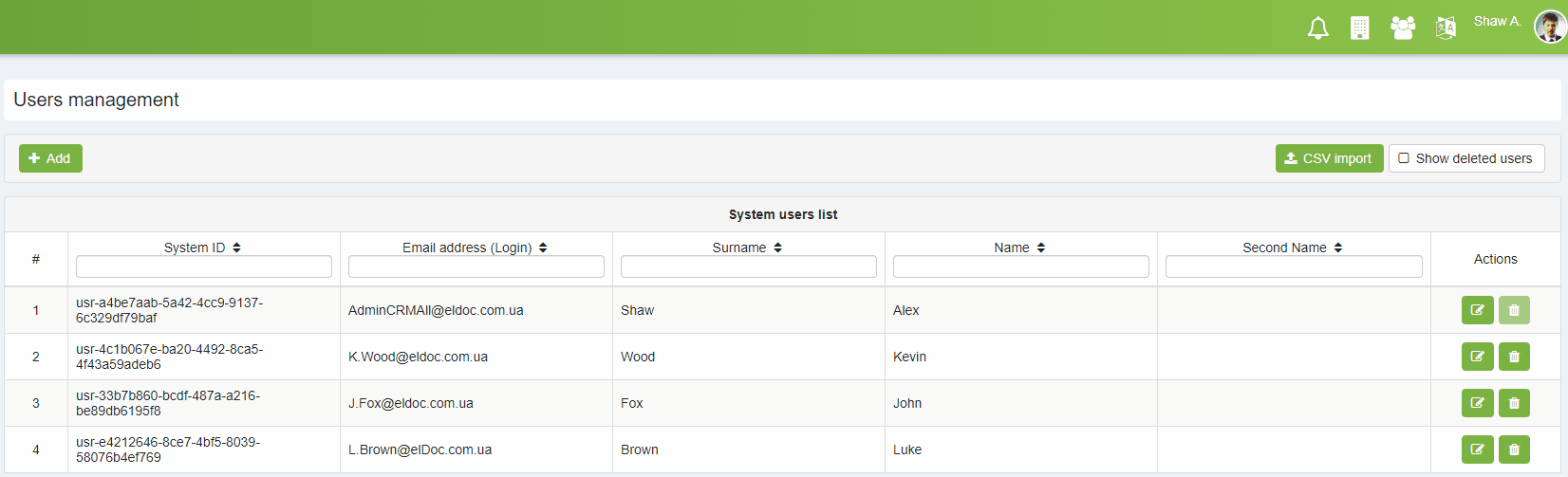 Users can be created directly within the elDoc system or imported via synchronization with MS Active Directory using the elDoc Configuration settings (System Settings - Configuration).